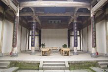 前廳是整幢房子中最精華的部分,大門后面聳立著一幅威儀的中門,在中門“福”字的上方,鑲有一幅木雕“百子鬧元宵”圖,圖上雕刻著100個(gè)小男孩過元宵鬧花燈時(shí)的情景,這正是古代“多子多!眰鹘y(tǒng)觀念的生動(dòng)寫照,“百子鬧元宵”圖兩邊的“商”字斗拱上則分別雕有四出《三國演義》的戲文,斗拱的上方雕有“南、北”財(cái)神,“南、北”財(cái)神的上方是閣樓護(hù)板,在此,汪定貴設(shè)計(jì)了“漁、樵、耕、讀”四根木雕立柱,分別代表了古代的四種職業(yè)。