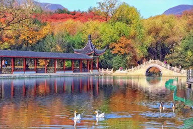 小江南:湖水面積16308平方米,湖邊小橋、挑臺、駁岸小路曲折。