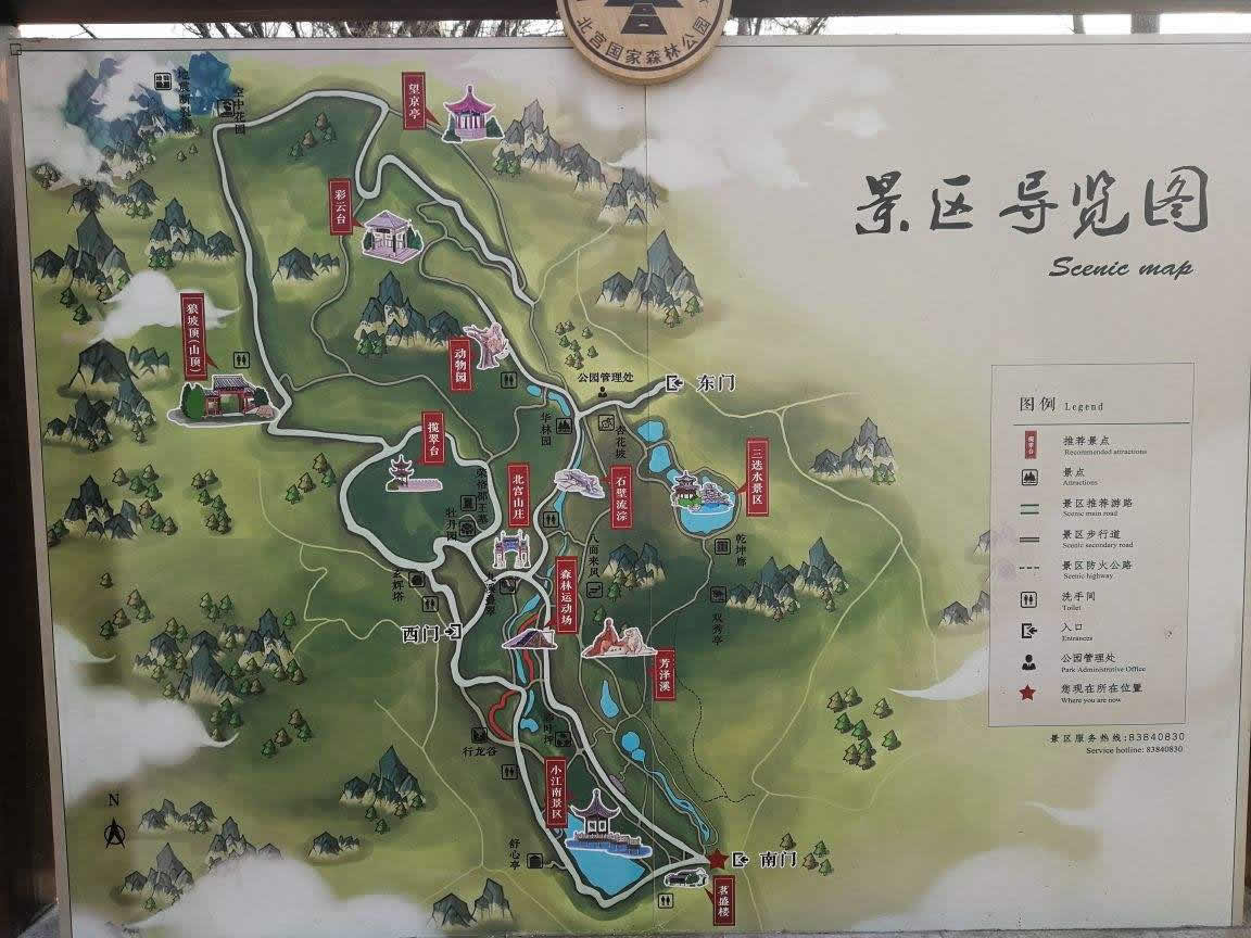 北京北宮國家森林公園,位于北京市豐臺區(qū)西北部山區(qū),距北京市中心20公里,是丘陵型自然風(fēng)景區(qū)。北宮因帝王憩地而得名。公園始建于2002年10月,2005年12月被國家林業(yè)局正式批準為國家級森林公園。公園總面積9.145平方公里,由東部、西部和中部三大景區(qū)和北宮山莊、茗盛樓兩組近10000平方米的配套設(shè)施組成。園內(nèi)有12處亭、廊、閣、塔等人文景觀,以及芳澤溪、小江南、楓林路、樺林溝等15處景點。綠化美化面積3000畝,優(yōu)質(zhì)樹種21種3.6萬株,野生花卉30余種5萬余平方米,園內(nèi)植物種類達到253種,形成了首都西部生態(tài)建設(shè)中的亮點。