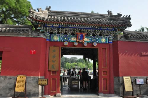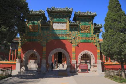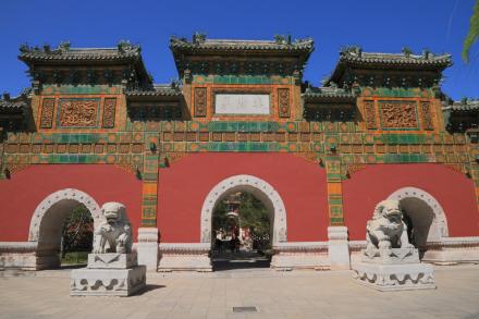 智珠殿,半月城位于瓊島東麓山腳下,座西面東與陟山橋相對,建于乾隆十六年(1751年)。智珠殿建在半月城城臺上,紅墻綠瓦,四面有五個牌樓相對,中軸對稱、布局別致是中國古建筑中比較少見的,殿內(nèi)原供奉文殊菩薩一尊。