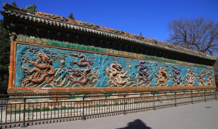 九龍壁是原大圓鏡智寶殿前的影壁,建于乾隆二十一年(1756年)。壁高5.96米,厚1.60米,長25.52米。壁的兩面用七色琉璃磚瓦鑲砌而成。兩面各有九條彩色大蟠龍,飛騰戲珠于波濤云際之中。壁上共有大小蟠龍635條。中國現(xiàn)存三座古代九龍壁,唯獨這座是雙面壁。
