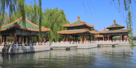 東岸濠濮間、畫舫齋、蠶壇等幾組庭院式園中之園,掩映在蒼松翠柏之中,既充滿天然之趣,又有江南私家園林的神韻!北岸自東向西有靜心齋、西天梵境、澄觀堂、九龍壁、闡福寺和極樂世界,五龍亭沿湖點綴,與自然山水巧妙地融為一體,一幅不露人工痕跡、宛若天成的山水畫卷!西岸廣植花木草坪,巧妙地運用中國造園技藝中的“障眼”手法,形成一種林中有景、花下藏幽的園林氛圍!