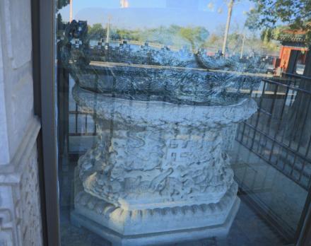 玉甕又稱“瀆山大玉海”,制作于至元二年(1265年)?诔蕶E圓形,通高70公分,周長493公分,重約3500公斤,周身浮雕海龍、海馬、海豬、海犀等出沒于波濤之中,栩栩如生。元世祖忽必烈曾將玉甕放置瓊?cè)A島廣寒殿中,傳說曾用以盛酒大宴群臣。明代廣寒殿倒塌,玉甕失落民間。清乾隆十年(1745年)發(fā)現(xiàn)后,乾隆皇帝“令以千金易之,置承光殿中”,乾隆十四年(1749年)建玉甕亭,將玉甕陳設(shè)于亭中配以漢白玉雕花石座,命翰林四十人,各賦詩一首,刻于亭柱之上。