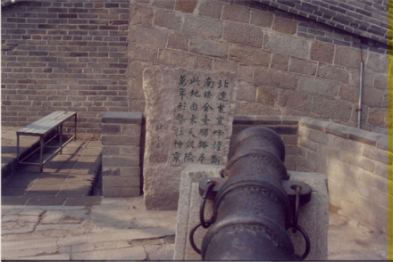 陳展于八達嶺關城內(nèi)登城入口處的馬道旁,共有五尊鐵炮,為當時的先進武器之一。其中最大一尊炮筒長2.85米,口徑105毫米,射程達千米以上,威力甚大。炮身上刻有"敕賜神威大將軍"字樣,為明代崇禎十一年(1638年)制造。該炮是1958年從八達嶺東十余里的張堡地方運來的。另外四尊牛腿小炮,為1957年整修長城時的出土文物,同時還發(fā)掘出數(shù)百枚炮彈,均為明朝制品。據(jù)《武備志》記載:“古代以機發(fā)石,其機之木架,形如虎蹲。后來使用火炮,炮身短而粗大,以發(fā)開花彈者,名虎蹲炮,俗稱田雞炮”,由此可見當時武器情況之強盛。