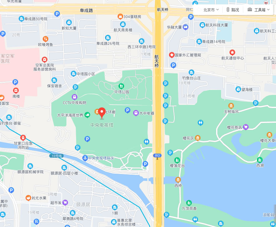 中央廣播電視塔,座落于北京西三環(huán)中路,東臨秀美的玉淵潭和著名的釣魚(yú)臺(tái),南靠新建的西客站,北瞰旅游勝地頤和園。占地 15.4公頃,塔高405米。是世界第五高塔,是世界高塔協(xié)會(huì)成員塔,是中國(guó)廣播電視學(xué)會(huì)高塔委員會(huì)成員塔,是集廣播電視發(fā)射和旅游觀光、餐飲娛樂(lè)為一體的綜合性建筑。寬闊的棧橋廣場(chǎng),漢白玉的退臺(tái)環(huán)廊,宮燈形的塔樓,祈年殿式的塔座,讓人流漣忘返。