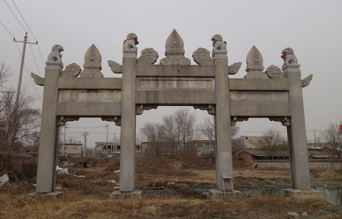 金成明墓石牌坊 金成明墓石牌坊位于青龍湖鎮(zhèn)北劉莊村東,是房山區(qū)文物保護單位。金成明,正史無考,據(jù)傳為乾隆皇帝的岳父。石牌坊建于清乾隆年間,坐北朝南,為四柱三門式石牌坊,艾葉青石質(zhì),面闊11.55米,明間寬4.20米,次間寬3.70米,四根方形通天柱寬0.6米。柱頂各雕刻有一小石犼,中間雕刻著三顆火焰珠,石坊中間刻有匾額。四周浮雕云紋與瑞獸。牌坊后有碑樓兩座,樓內(nèi)各有螭首龜趺碑記一座,東南側(cè)還有一塊無碑亭的小碑。
