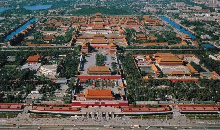 故宮位于北京城中心,布局依據(jù)《周禮·考工記》中所載:“左祖、右社、面朝、后市”的原則,建筑在北京城南北長八公里的中軸線上,南北取直,左右對稱。如今故宮左前面的勞動人民文化宮,明清是皇帝祭祀祖宗的太廟;右前面的中山公園是皇帝祭祀土神和谷神的社稷壇;前面有朝臣辦事的處所;后面有人們進行交易的市場。北京故宮的北面是萬歲山,南面是金水河,恰好符合古人“負陰抱陽,沖氣為和”的建宮原則,萬歲山是專門為營造皇城風(fēng)水而筑城的一座人工山,完成于明初,位于元代寢宮延春閣舊址,用開挖護城河和南湖的淤泥堆積而成。此山的堆筑,一方面滿足了皇城要“負陰”的原則,另一方面又鎮(zhèn)住了前朝的風(fēng)水,故萬歲山又有“鎮(zhèn)山”之稱。北京四九城的布局是二龍出水護著紫禁城。依照中國古代星象學(xué)說,紫微星(即北極星)位于中天,乃天帝所居,天人對應(yīng),是以皇帝的居所又稱紫禁城。
