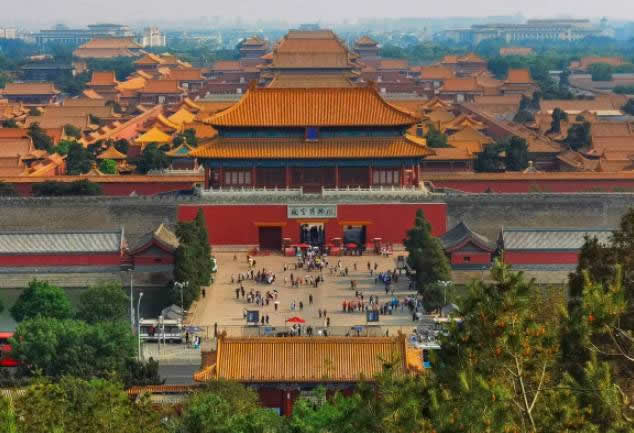 故宮宮城周圍環(huán)繞著高12米,長3400米的宮墻,形式為一長方形城池,墻外有52米寬的護城河環(huán)繞,形成一個森嚴壁壘的城堡。故宮有4個門,正門名午門,東門名東華門,西門名西華門,北門名神武門。面對北門神武門,有用土、石筑成的景山。在整體布局上,景山可說是故宮建筑群的屏障。