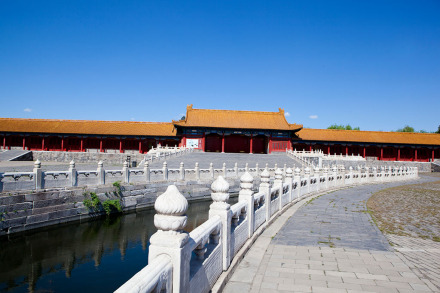 太和門前有面積約26000平方米的廣場,內(nèi)金水河自西向東蜿蜒流過。河上橫架五座石橋,習(xí)稱內(nèi)金水橋。廣場兩側(cè)是排列整齊的廊廡,習(xí)稱東、西朝房,并有協(xié)和門(明代稱會極門)和熙和門(明代稱歸極門)東西對峙。東側(cè)廊廡在明代用作實錄館、玉牒館和起居注館,清代改作稽察欽奉上諭事件處和內(nèi)誥敕房。西側(cè)廊廡在明代為編修《大明會典》的會典館,清代改為繙書房和起居注館。