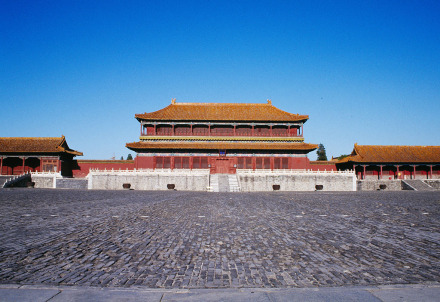 午門是故宮的正門。俗稱五鳳樓。東西北三面以12米高的城臺相連,環(huán)抱一個方形廣場。有1組建筑。正中有重樓,是9間面寬的大殿,重檐廡殿頂,在左右伸出兩闕城墻上,建有聯(lián)檐通脊的樓閣四座,明廊相連,兩翼各有13間的殿屋向南伸出,四隅各有高大的角亭,輔翼著正殿。這組城上的建筑,是故宮宮殿群中第一高峰。午門是皇帝下詔書、下令出征的地方。它當(dāng)中的正門平時只有皇帝才可以出入;皇帝大婚時皇后進一次;殿試考中狀元、榜眼、探花的三人可以從此門走出一次。文武大臣進出東側(cè)門,宗室王公出入西側(cè)門。