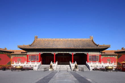 交泰殿為內(nèi)廷后三宮之一,位于乾清宮和坤寧宮之間,約為明嘉靖年間建。交泰殿平面為方形,深、廣各3間。明間設(shè)寶座,上懸康熙帝御書“無為”匾,寶座后有板屏一面,上書乾隆帝御制《交泰殿銘》。交泰殿為皇后千秋節(jié)受慶賀禮的地方。清代于此殿貯清二十五寶璽。每年正月,由欽天監(jiān)選擇吉日吉時,設(shè)案開封陳寶,皇帝來此拈香行禮。清世祖所立“內(nèi)宮不許干預(yù)政事”的鐵牌曾立于此殿。皇帝大婚時,皇后的冊、寶安設(shè)殿內(nèi)左右案上。每年春季祀先蠶,皇后先一日在此查閱采桑的用具。