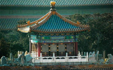 御景亭位于御花園內(nèi)東側(cè)的假山頂上。原是明代觀花殿的舊址,萬歷間改堆假山。山的東西山石間各有登道,拾級而上可達山頂御景亭。亭子平面方形,四柱,一斗二升交蔴葉斗栱,攢尖頂,上覆翠綠琉璃瓦,黃色琉璃瓦剪邊,鎏金寶頂,四面設(shè)隔扇門。四周圍繞著漢白玉石欄板。亭內(nèi)天花藻井,面南設(shè)寶座。御景亭是皇帝、皇后在農(nóng)歷九月初九重陽節(jié)登高的地方。自亭上可俯瞰宮苑,遠眺故宮、景山、西苑。