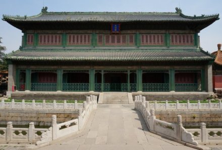 文淵閣是文華殿后的藏書樓,乾隆四十一年(1776年)仿浙江藏書名樓“天一閣”建造。閣分上下兩層,黑色琉璃瓦覆頂,綠色琉璃瓦剪邊,色調(diào)深沉雅致,又寓含五行中黑色主水,以水克火的用意。閣內(nèi)藏《四庫全書》與《欽定古今圖書集成》,清代乾隆朝以后,除了皇帝來這里讀書外,也允許臣工和學(xué)士們來此查閱圖書。