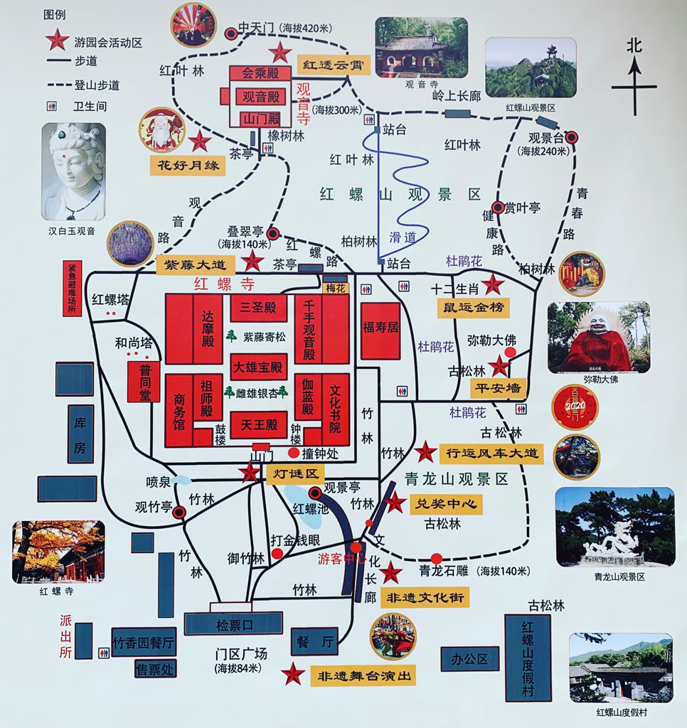 紅螺寺北依的紅螺山,南麓較平緩,有修砌的登山步道可到達紅螺山頂,極易游人攀登。山上的植被分柏樹林區(qū)、松樹林區(qū)、紅葉林區(qū),站在紅螺山之巔,舉目四望:南方是蒼茫無際的平原,田園、村落、城鎮(zhèn)鎮(zhèn)盡收眼底;西北是綿延無際的軍都山脈,在群山環(huán)繞、峰回路轉(zhuǎn)之間,萬里長城像巨龍一樣蜿 蜒于群山之巔;向東眺望:雁棲湖、青龍峽的秀美景色盡收眼底。紅螺寺景區(qū)分紅螺山、紅螺寺、觀音寺、呈秀園、松林浴園、五百羅漢園六大景區(qū),又有“御竹”、“雌雄銀杏”、“紫藤寄松”三絕景點綴其間,人文景觀與自然景觀和諧完美地融合為一體,因而紅螺寺景區(qū)是人們禮佛拜祖、登山健身、觀光游覽、怡神靜心的好地方。