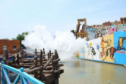 奧德賽之旅:亞洲最高的雙提升激流勇進,小船分別在10米和26米的高點,順勢下沖,提升到約74km/h的時速,濺起巨大的水浪,涌動著漂流的小舟。水浪不僅會灑落在剛剛結(jié)束探險之旅的小船上,也會濺到港灣觀看的人群中。