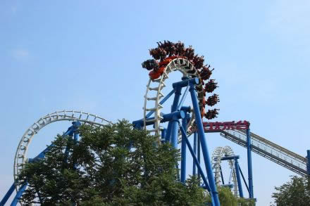 雪域金翅:進口懸掛翻滾過山車,在“大俯沖”中鳥瞰大地,在”豎直回環(huán)“中體會超重,在“眼鏡蛇回環(huán)”中體會身體翻滾,接下來的是“零重力翻滾”、“側(cè)向盤旋”。