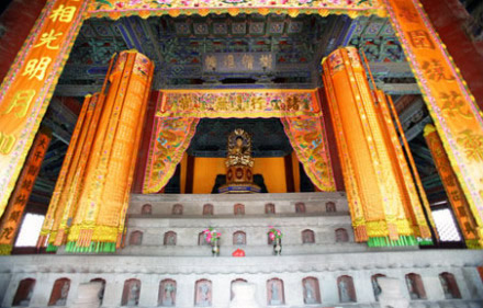 戒壇:設(shè)于西北院,為高3.5米的漢白玉方臺,雕刻精美。環(huán)壇雕刻113尊一尺多高的戒神,壇上供奉釋迦牟尼坐像。像前有十把雕花木椅,即和尚受戒時“三師七證”的座位。該戒壇為明代遺物,與杭州昭慶寺、泉州開元寺戒壇并稱中國三大戒壇,戒臺寺居首,被譽為“天下第一戒壇”。戒臺大殿是戒臺寺的標(biāo)志,也是寺內(nèi)最為主要的建筑。大殿正門上方高懸漆金大匾,上書“選佛場”三個大字,為袁世凱手書。殿內(nèi)的天花板為金漆彩繪,殿頂正中部分是一個“斗八藻井”。藻井內(nèi)縱深分為上圓下方兩個部分。井口內(nèi)壁雕有許多小天閣,每閣內(nèi)都雕有佛龕,龕內(nèi)則供有金裝小佛,寶相莊嚴(yán)。門內(nèi)橫舫上則掛有清代乾隆皇帝手書的“樹精進幢”金字橫匾,內(nèi)側(cè)掛有康熙親筆的“清戒”二字匾額?梢姅(shù)朝對戒臺寺感情之深,著力之重。不僅如此,戒臺殿內(nèi)的113尊戒神也是不可多得的奇景,那133尊泥塑金身,神形各異,有的威武雄壯,有的面目猙獰,有的頂盔貫甲,有的仙風(fēng)道骨,卻一個個栩栩如生,生動傳神。這是迄今為止,北京地區(qū)絕無僅有的一組戒神塑像,難得的藝術(shù)珍品。