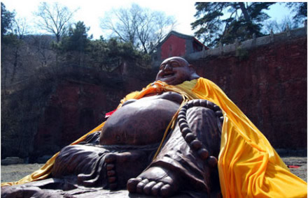 彌勒佛:千佛閣上坐神佛,納得天下福滿門。千年香樟木雕彌勒佛,作為戒臺寺唯一一尊露天佛,常得日月之光,納天地靈氣,立于千佛閣上修得萬佛之心,用萬世不變的歡喜笑顏,用大肚笑納天下事,也容載著天下人的希望。彌勒佛即未來佛,俗稱大肚彌勒,他強調(diào)要大度能容,不要計較人世間的是非憎愛。大肚彌勒寓神奇于平淡,示美好于丑拙,顯莊嚴(yán)于詼諧,現(xiàn)慈悲于揶揄,代表了中華民族寬容、和善、智慧、幽默、快樂的精神。香樟木質(zhì)地堅硬,且具香氣,是明清時期宮廷木器三大主要用材之一。香樟木年份越久越珍貴,千年香樟木自然就成了可遇不可求的無價之寶。戒臺寺此件木雕大佛系為一整塊千年香樟木根雕,雕工精美,形態(tài)可鞠,盤腿而坐,袒胸露腹,自然形態(tài)惟妙惟肖。