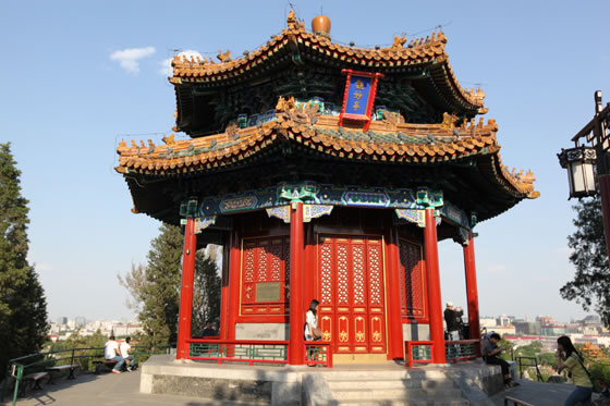 萬春亭:位于景山的中峰,中峰的相對高度為45.7米,是北京城南北中軸線上最高和最佳的觀景點。萬春亭位于景山最高處,建于乾隆十五年(1750年),是北京南北建筑中軸線的基點。被譽為北京中軸線上的制高點,京華覽勝第一處。亭高15.38米,平面呈四方形,為三重檐四角攢尖頂,上檐和中檐均為九踩三昂斗拱,下檐為七踩重昂斗拱,黃琉璃瓦覆頂綠剪邊,檐上有琉璃寶頂,建筑面積296.5平方米。萬春亭的彩繪稱為:旋子大點金龍錦枋心,這也是中國皇家等級最高的彩繪形式。萬春亭內(nèi)供奉著“毗盧遮那佛”,毗盧遮那佛也稱為大日如來佛,是釋迦牟尼佛的法身。毗盧遮那佛為密宗金剛界五方如來之首,在五方佛中代表法界體性智。亭中所供原佛像于二十世紀(jì)六十年代被損毀,重塑歸安后于2000年正式對外開放。