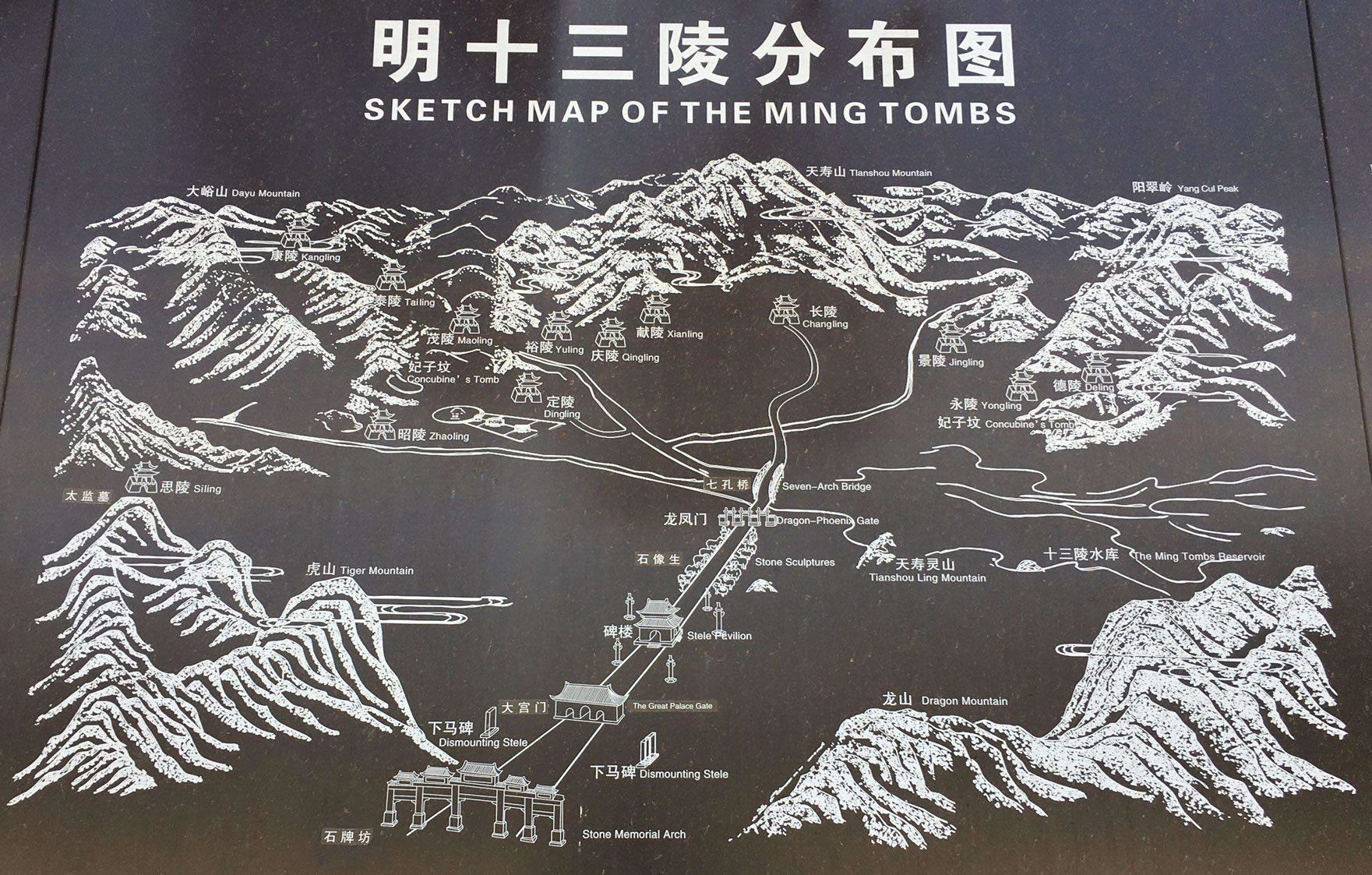 陵區(qū)內(nèi)共計(jì)葬有皇帝13人、皇后23人、皇貴妃1人,以及數(shù)十名殉葬貴妃。除皇帝陵外,陵區(qū)內(nèi)還有明朝妃子園寢七座,太監(jiān)墓一座,以及神宮監(jiān)、祠祭署等若干附屬建筑,形成了體系完整、規(guī)模宏大、氣勢(shì)磅礴的陵寢建筑群,成為世界上保存完整、埋葬皇帝最多的帝王墓葬群。