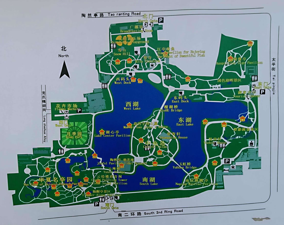 陶然亭公園內(nèi)有勝春山房景區(qū)、華夏名亭景區(qū)、陶然佳境景區(qū)、陶然佳境景區(qū)、潭影流金景區(qū)等各具特色的景區(qū)。其中著名的陶然亭位于湖中央島的陶然佳境景區(qū),陶然亭周圍,有許多著名的歷史勝跡。西北有龍樹寺,寺內(nèi)有蒹葭簃、天倪閣、看山樓、抱冰堂等建筑,堪與陶然亭相匹。東南有黑龍?zhí)、龍王亭、哪吒廟、刺梅園、祖園;西南有風(fēng)氏園;正北有窯臺;東北有香冢、鸚鵡冢,以及近代的醉郭墓、賽金花墓等。這些歷史勝跡產(chǎn)生年代多早于陶然亭,有的甚至早于慈悲庵。它們都有文人墨客觴詠的歷史,曾現(xiàn)過各領(lǐng)風(fēng)騷的輝煌時期。