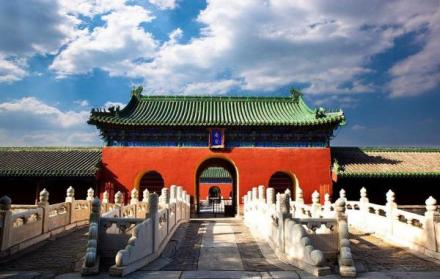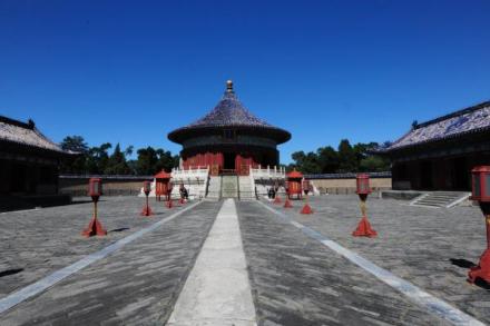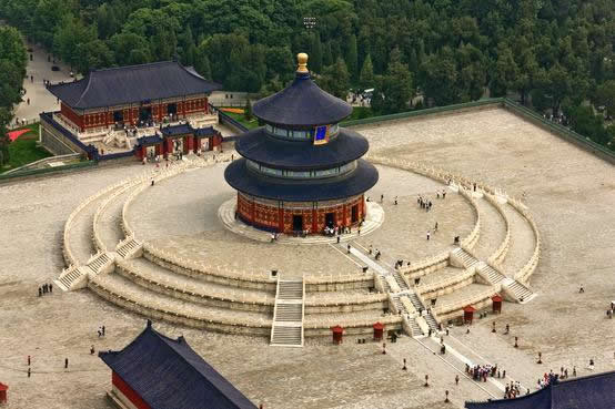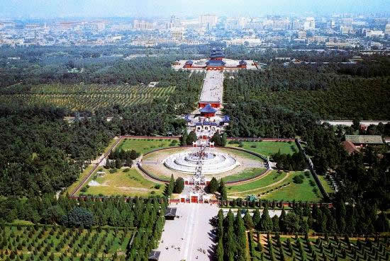 天壇公園由兩道壇墻環(huán)繞,被分為“內(nèi)壇”“外壇”兩部分;域北呈圓形,南為方形,寓意“天圓地方”;主要由春季祈禱豐年的“祈谷壇”,冬至日祭天的“圜丘壇”,皇帝祭祀前居住的齋宮、演習(xí)祭祀禮樂(lè)的神樂(lè)署四大古建筑群組成;祈谷壇中的祈年殿是北京市的標(biāo)志性建筑。天壇公園外壇種植有大量古柏林。