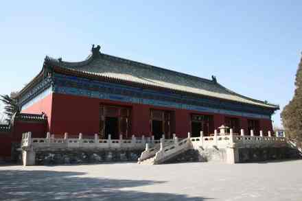 無(wú)梁殿:即齋宮正殿,建于明永樂(lè)十八年(1420年)。此殿因以磚拱承重,不用梁枋而得名。皇帝進(jìn)出齋宮均在此舉行有關(guān)禮儀,F(xiàn)殿內(nèi)按乾隆時(shí)期原貌陳列,橫額“欽若昊天”為乾隆御筆,屏風(fēng)、寶座均為原物。