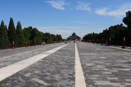 丹陛橋長(zhǎng)360米,是連通圜丘壇和祈谷壇的一條高出地面4米的大道。大道中部下有東西向券洞通道,故名橋,是北京最古老的“立交橋”。橋面寬30米,中間石板大路為“神路”,供天帝專用;東側(cè)磚砌路面稱“御路”供皇帝專用,陪祀王公大臣只能在西側(cè)的“王路”上行走,上下進(jìn)退等級(jí)分明。丹陛橋北高南低,北行令人步步登高,如臨天庭。