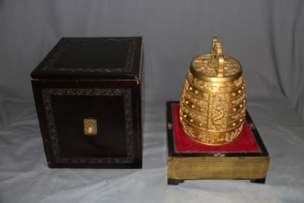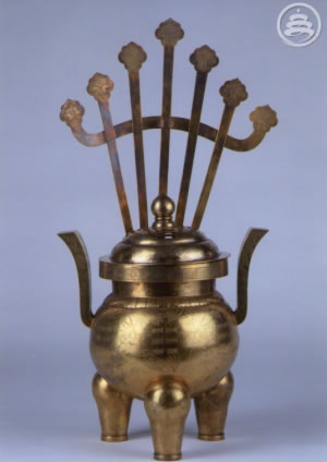 鍍金銀質(zhì)。體圓,直口平唇,短頸,鼓腹,兩側(cè)飾天官耳,腹下三足。爐口雷紋,通體刻八卦云鶴紋。爐蓋圓形,疊二層,上層鏤空乾、兌、震紋,后有香靠具缺刻。香靠具一付,從爐體內(nèi)壁靠具槽處插入爐內(nèi)。香靠具七出,鶴紋如意云頭,中間香插有圓框,以插圓形柱香。爐底陰刻楷書款“恒利銀號(hào)造京平足紋,重一百九十一兩五錢,鍍金十五兩三錢”“光緒癸卯年制”。