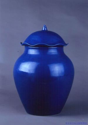 瓷質(zhì)。直口,平唇,短頸,豐肩,收腹,隱圈足。荷葉形蓋,子口,蓋上刻荷葉莖脈紋,螺鈕。器身外通施祭藍(lán)釉,器內(nèi)施白釉。純素。底書青花“大清光緒年制”六字雙行楷書款。