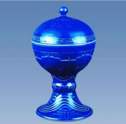 瓷質(zhì)。圓口平唇,弧腹,喇叭形高足中空。腹依次為垂云紋、回紋,校圍波紋、金鈑紋,足為波帶黻紋;⌒紊w,珠鈕,子口。蓋上飾星紋、垂云紋、回紋。器身外通施祭藍(lán)釉,器內(nèi)施白釉。足內(nèi)白釉。