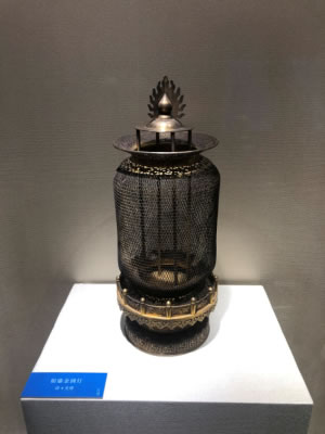 鍍金銀質(zhì)。由燈罩、燈座兩部分組成,整體圓柱籠形,罩、座可拆分。圓須彌座,浮雕卷草紋、蓮瓣紋,座臺(tái)欄桿上下鏤刻如意云紋欄板、掛落。座臺(tái)中心4柱燈提,貫穿于燈罩內(nèi),柱頂三叉火焰珠。燈罩用軟金絲編織成鏤空網(wǎng)狀圓筒籠形,上下收口,敞檐鏤刻纏枝蓮寶相花紋。底部陰刻楷書款,右為打造銀號(hào)和重量“恒利銀號(hào)造京平足紋,重二百兩一錢”,中為六字雙行“光緒癸卯年制”,左為鍍金重量“鍍金十六兩”。每燈重量和鍍金重量不同,刻款不同,因此每件皆為孤品。