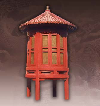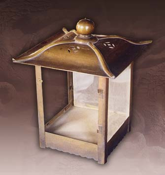 清末造。通高36.5厘米,檐方28厘米,足方20.6厘米。方形,四邊銅框,凹面玻璃心,一面為門,銅框兩側(cè)、底云花裝飾,挑形活頁(yè)二,桃形吊環(huán),底邊有花紋,蓋頂穹隆形,四脊間飾四縷空金錢眼紋,頂飾圓尖鈕。陳設(shè)于祭壇正位前和臺(tái)階上,用于祭祀時(shí)照明。