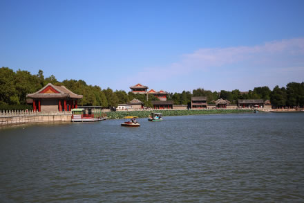 昆明湖是清代皇家諸園中最大的湖泊,湖中一道長(zhǎng)堤──西堤,自西北逶迤向南。西堤及其支堤把湖面劃分為三個(gè)大小不等的水域,每個(gè)水域各有一個(gè)湖心島。這三個(gè)島在湖面上成鼎足而峙的布列,象征著中國(guó)古老傳說(shuō)中的東海三神山──蓬萊、方丈、瀛洲。西堤以及堤上的六座橋是有意識(shí)地摹仿杭州西湖的蘇堤和“蘇堤六橋”。西堤一帶碧波垂柳,自然景色開(kāi)闊,園外數(shù)里的玉泉山秀麗山形和山頂?shù)挠穹逅芭抨Y而來(lái),被收攝作為園景的組成部分。