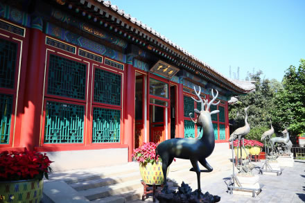 堂前有慈禧乘船的碼頭“樂(lè)壽堂”黑底金字橫匾為光緒手書(shū)。樂(lè)壽堂庭院內(nèi)陳列著銅鹿、銅鶴和銅花瓶,取意為“六合太平”。院內(nèi)花卉植有玉蘭、海棠、牡丹等,名花滿(mǎn)院,寓“玉堂富貴”之意。