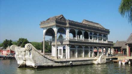 清晏舫俗稱(chēng)石舫,在長(zhǎng)廊西端湖邊,是一條大石船,寓“海清河晏”之意,是頤和園唯一帶有西洋風(fēng)格的建筑。它的前身是明朝圓靜寺的放生臺(tái)。乾隆修清漪園時(shí),改臺(tái)為船,更名為“石舫”。石舫長(zhǎng)36米,船用大理石雕刻堆砌而成。 船身上建有兩層船樓,船底花磚鋪地,窗戶(hù)為彩色玻璃,頂部磚雕裝飾。下雨時(shí),落在船頂?shù)挠晁ㄟ^(guò)四角的空心柱子,由船身的四個(gè)龍頭口排入湖中。