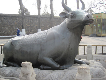銅牛在昆明湖東岸,十七孔橋東橋頭北側(cè),為鎮(zhèn)壓水患而設(shè)。乾隆二十年1755年用銅鑄造,稱(chēng)為“金!。