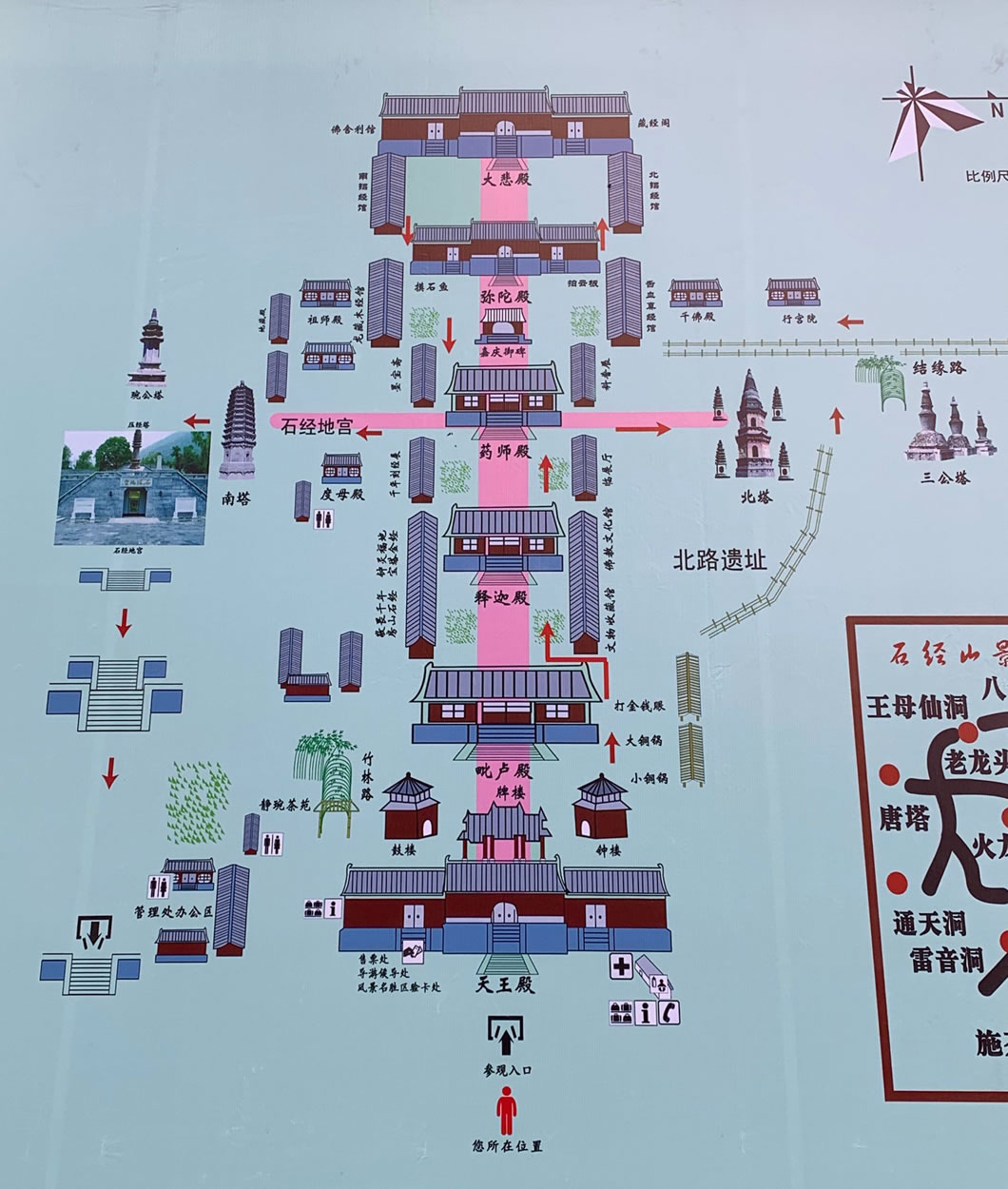 石經(jīng)山海拔450公尺,山腰有9個藏經(jīng)洞,其中雷音洞為開放式,洞內(nèi)寬廣如殿,四壁鑲嵌經(jīng)板大都是靜琬早期所刻。洞中有四根石柱,石柱上雕佛像1056尊,故稱千佛柱,九洞共藏經(jīng)4196塊。石經(jīng)山現(xiàn)存唐塔兩座,還有石鑿古井、隋唐碑刻等大批歷史遺存。為了便于游客上山觀光攬勝,云居寺于1999年10月24日開通了全長830米的石經(jīng)山索道。