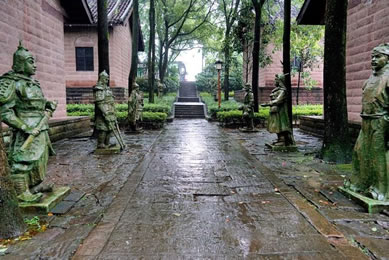 忠義祠位于護(hù)國寺右側(cè),與寺內(nèi)藥師殿僅一墻之隔,有門洞與護(hù)國寺相通,也可從護(hù)國寺右側(cè)小道進(jìn)入。始建于明弘治七年(1494年),原名“王張祠”,祀王堅(jiān)、張玨二將忠烈。明弘治十二年(1499年),合州知州宋琢見“王張祠”簡陋而集資整修。明正德十二年(1517年),合州知州佘崇鳳刻石立碑并培修祠宇。清初,“王張祠”遭兵亂,片瓦無存。清乾隆二十四年(1759年),合州知州王采珍重修,立余玠、王堅(jiān)、張玨、冉琎、冉璞5位牌位祀祭,改祠名為“忠義祠”。后歷經(jīng)培修。忠義寺整座建筑由正廳、耳房和左右?guī)拷M成,采用均衡對(duì)稱式,在縱軸線主要建筑物相對(duì)對(duì)峙,構(gòu)成大門進(jìn)出的三合院。整座庭院東西寬20米,南北縱深30米。進(jìn)入石坊形大門是一個(gè)院壩兩面的廂房,拾級(jí)而上至正廳。迎面高懸“忠義千秋”金字巨匾,匾下祭臺(tái)上排列余玠、王堅(jiān)、張玨、冉琎、冉璞牌位。祭臺(tái)正面有祝文:“維神才兼武,志秉忠貞。畫地成城,據(jù)形勝而保蜀土;協(xié)力戰(zhàn)守,遺魚餅以退元戎。忠誠貫日星,先后相繼;大節(jié)凌霄漢,古今照臨。茲屆仲春修祀典,肅陳籩豆,伏維來歆。尚饗。”廳堂楹柱有華國英撰寫的對(duì)聯(lián),上聯(lián)“持竿以釣中原,二三人盡瘁鞠躬,直拼得蒙哥一命”;下聯(lián)“把盞而澆故壘,十萬眾披肝瀝膽,竟不圖王立二心”。忠義祠內(nèi)有宋孝宗時(shí)期碑文4塊,宋光宗時(shí)期2塊,宋寧宗時(shí)期5塊,乾道年間以后22塊,其中記錄釣魚城之戰(zhàn)史跡的12塊。