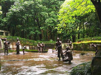 采石場遺址位于釣魚城基本陳列一展廳正對(duì)的游步道頂端。為讓游人了解釣魚城筑城之艱難與古代民眾付出之艱辛,遺址還原了700多年前釣魚城筑城采石的勞動(dòng)場景,其中的人物雕塑大小比例與真人一致。他們有的手握鋼釬在撬石頭,有的拿著手錘打鏨子,有光著胳膊抬石頭,同時(shí)還有前來送水的婦女與小孩,每個(gè)人物惟妙惟肖,充滿濃郁的生活味。
