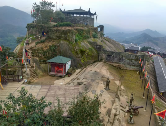滑石寨位于金帶鎮(zhèn)滑石村3組,是平壩上突兀拔起的一座高260多米的孤峰。孤峰呈紡錘形,四周皆是懸崖峭壁,峰頂平地有6000平方米左右。峰西是一堵傾斜約75度、近10萬平方米的完整石壁,石壁上鑿有一條寬不盈尺的之字形石階,它是通達(dá)寨上的惟一路徑。從山下到寨上要走1個(gè)多小時(shí)路程,其中要經(jīng)過2000多級(jí)在石壁上開鑿的石階,山腰到山頂分別有兩道寨門把守。記者在現(xiàn)場看到,山腰一道寨門門楣上清晰刻寫著“未雨,嘉慶二年十月立”字樣。登上寨頂,數(shù)十間木質(zhì)結(jié)構(gòu)的房瓦痕跡依稀可見,青石砌的寨門和寨堡仍保存完好,四道墻體上都開有射擊孔。整個(gè)寨堡耗石約1萬多方,工程浩大,令人稱奇。