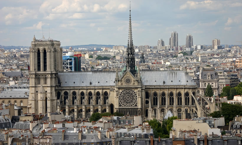 巴黎圣母院 巴黎圣母院(法語:Cathédrale Notre Dame de Paris),又名巴黎圣母主教座堂、巴黎圣母院大教堂,位于法蘭西共和國首都巴黎市中心城區(qū),地處塞納河中央西堤島上,與巴黎市政廳和盧浮宮隔河相望,為哥特式基督教教堂建筑;始建于1163年3月24日(羅馬教皇亞歷山大三世四年),是基督教支派天主教巴黎總教區(qū)主教座堂、法國首都最悠久和最具象征意義的紀念碑之一、歐洲最著名的哥特式大教堂之一、法國最具代表性的文物古跡和世界遺產(chǎn)之一,法國及歐洲文學(xué)文化地標建筑。 巴黎圣母院平面為長形馬蹄哥特式拉丁十字形制,總長約127米,總寬約48米,總高達96米,總建筑面積達5500平方米,總占地面積達6000平方米;西立面置有兩座鐘塔,高約69米;內(nèi)部共有五個縱艙,包括一個中艙與兩側(cè)各兩個的翼艙,十字的頂部是祭壇,十字長翼是圣母院長方形主殿;東端是圣壇,后為半圓形的外墻,橫廳兩個盡段都有開門,旁置小塔;圣壇外有標志性尖塔,高96米。巴黎圣母院是世界上第一座完全意義上的哥特式教堂,建筑本體的雕刻藝術(shù)和繪畫藝術(shù)及堂內(nèi)珍藏的大量藝術(shù)珍品具有極高的歷史文化價值和蜚聲中外的世界聲譽,是法國巴黎的象征,世界主流宗教基督教圣地。