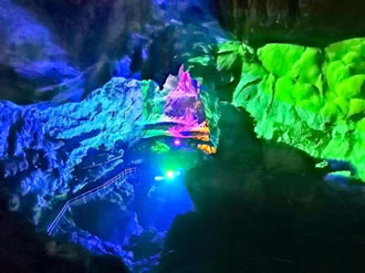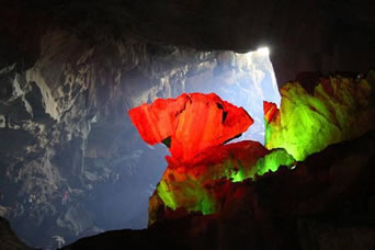 自藏禾洞沿石階而上,便到了雷公洞。洞內(nèi)石筍和石鐘乳十分發(fā)達,因巖石含有碳酸鈣、鐵質(zhì)、方解石、石英等成分,整個洞廳色彩斑斕。洞底暗河水聲隆隆,猶如雷鳴,故而得名。傳說天上雷神每年都要下來巡洞一次,在這里休息。