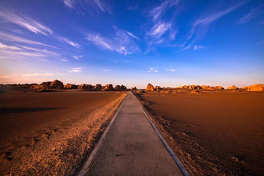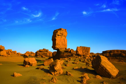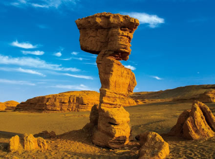 柱狀雅丹,是形態(tài)最為獨特的柱狀雅丹體。上部的粘土層難風(fēng)化,而下部的沙質(zhì)層卻易于風(fēng)化。這種差異形成了頂部粗大的塊體高懸于下部細小的柱體之上,在形態(tài)上似天外來客眺望凝思,吸引著游人去探索它的奧秘。