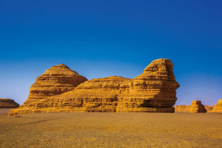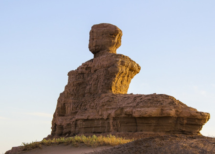 墻狀雅丹,屬于墻狀雅丹體向塔狀雅丹體的過渡類型。雅丹體由沙質(zhì)和泥質(zhì)沉積物組成,差異侵蝕風(fēng)化作用形成了凹凸不平的表面。遠遠望去,酷似埃及的“獅身人面像”,充分展示了大自然的巧奪天工。