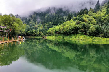 官鵝溝水美。13個大小不等、形態(tài)各異的湖泊,尤如一串綠色的珍珠鑲嵌在溝內(nèi),湖水清澈透底,隨湖底地貌高低呈不同顏色,那些倒映在湖中的古樹象一條條巨龍臥在湖底。藍(lán)天白云和青山古樹,映入湖中,使天地渾然一體,沒有界限。