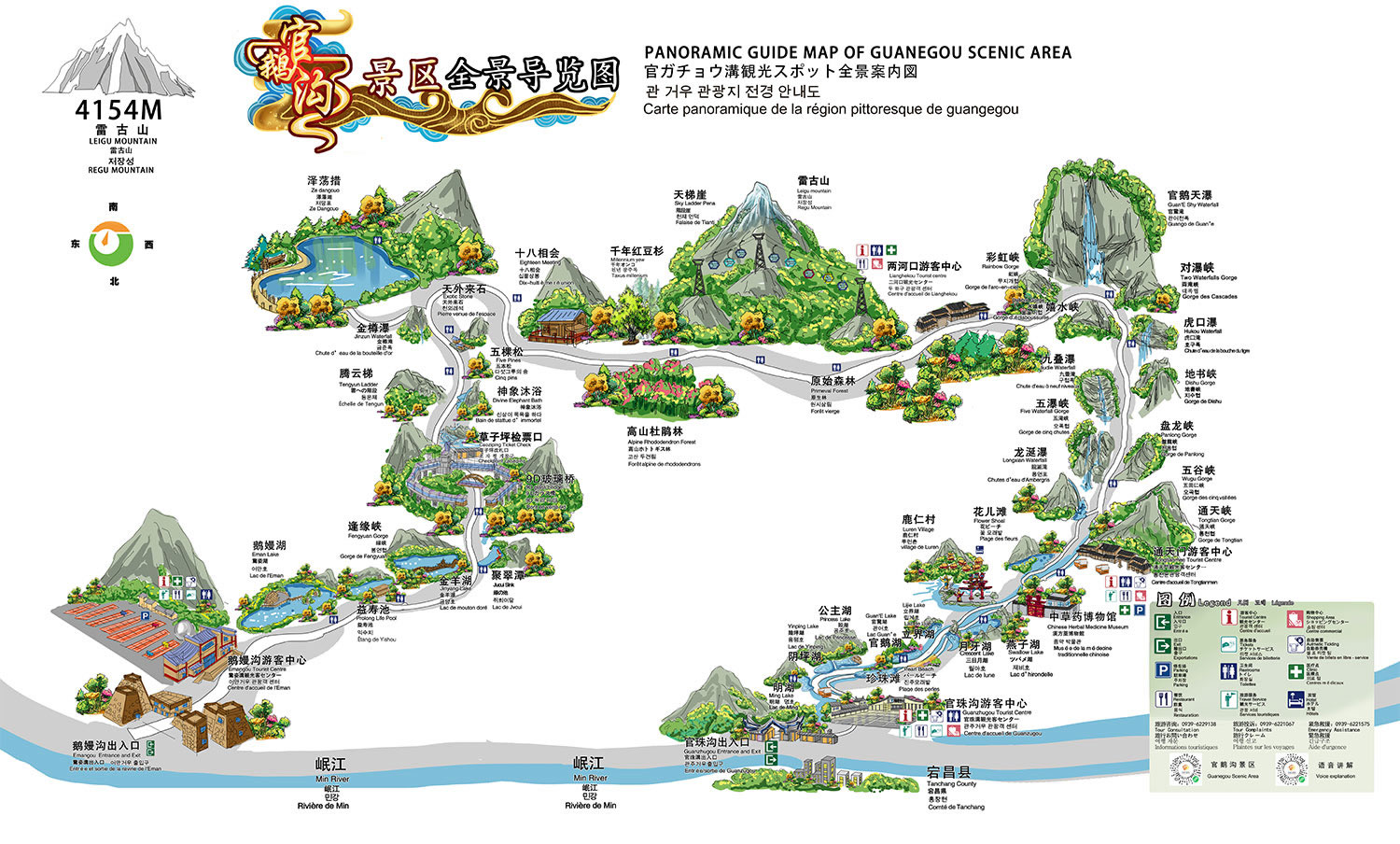 溝內(nèi)前14公里為13個色彩斑斕的湖泊,后18公里為松柏茂密的原始森林,有9道高聳入云的險峻峽谷,有11處從山頂或半山懸崖上直瀉而小的大小瀑布,有60余處令人贊嘆的景點,最深處為高山草甸和終年不化的雪山。