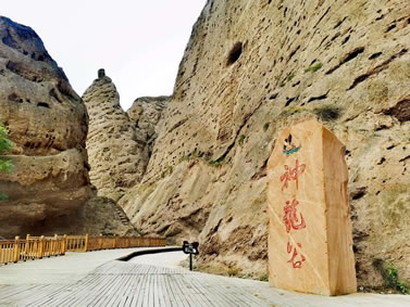 這里的石柱石筍大多高達(dá)八十至一百米之間,最高達(dá)二百多米,均由橘黃色砂礫巖構(gòu)成,鬼斧神工,猶如雕塑大師之夢幻杰作。我們左行至飲馬溝入口,換乘當(dāng)?shù)剞r(nóng)民裝扮得極富民俗風(fēng)情的驢車前行。進(jìn)入峽谷,兩邊布滿了巨大的石筍、石人、石鐘、石崖、石窟,峰回路轉(zhuǎn),步移景變,人們將石景命名為:大象吸水、千帆競發(fā)、伴侶駝、“黃河母親”等等,其形神兼?zhèn),栩栩如生?/p>