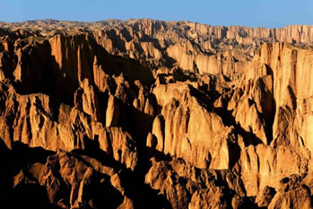 石林則依著黃河的彎轉(zhuǎn),藐著黃河的水流,這個(gè)場面保持著一種驚心動(dòng)魄的興奮,一看就是飛逝而去的千萬年啊,千萬年。老龍灣像一條長長的、波光粼粼的跑道,黃河拍打著細(xì)浪,從聳立的石林中,陡峭的巖石旁流過去,固執(zhí)地向干涸遙遠(yuǎn)的北方挺進(jìn)。風(fēng)吹過,水涮過,千萬年的歲月,靈動(dòng)和冥想,一路歌舞狂歡。突然一剎那就是永恒。停在那里回轉(zhuǎn)的頭型,飄飛的發(fā)絲,閃逸的裙裾一下子被動(dòng)結(jié)了,面目間的笑意還沒有來及抹去。假如有一天,您也來到石林,是否會(huì)為這一片晴朗而遼闊的天空下毫無造作、天然凝就的靈魂而感動(dòng)和震撼?大自然的神筆飛揚(yáng),你縱然放開想象,馳騁神思。望尖銳或圓錐狀的山峰,基部相連的簇狀,是石林發(fā)育地貌形態(tài)。只要能夠聯(lián)想到的物象,毫無例外活生生矗立在你的眼前,仰觀景慕,活靈神現(xiàn);你沒有想到的也一幕幕向你襲來,目不暇接。山峰如聚,峰嶺沸騰了一般,黃河石林以它非石非巖的特質(zhì),在這塊土地上托起一個(gè)立體的神話。雅丹、丹霞、峰林為一體的地貌奇觀寫意了恢弘的場景,刀鋒擁擠,千軍涌動(dòng),萬馬奔騰,這儼如一個(gè)拼殺的戰(zhàn)場,風(fēng)行走其間鼓動(dòng)著金屬碰撞的鏗鏘,它不再是一個(gè)夸張的舞臺(tái),場面不再是一個(gè)宏大的舞池。穿越石林,我們不自主地感知黃土高原的陽剛的軀身,緘默的神態(tài),堅(jiān)毅的面容,它在風(fēng)雨中矗立,日復(fù)一日,從不愿放棄對大地的眷戀,對太陽的向往。