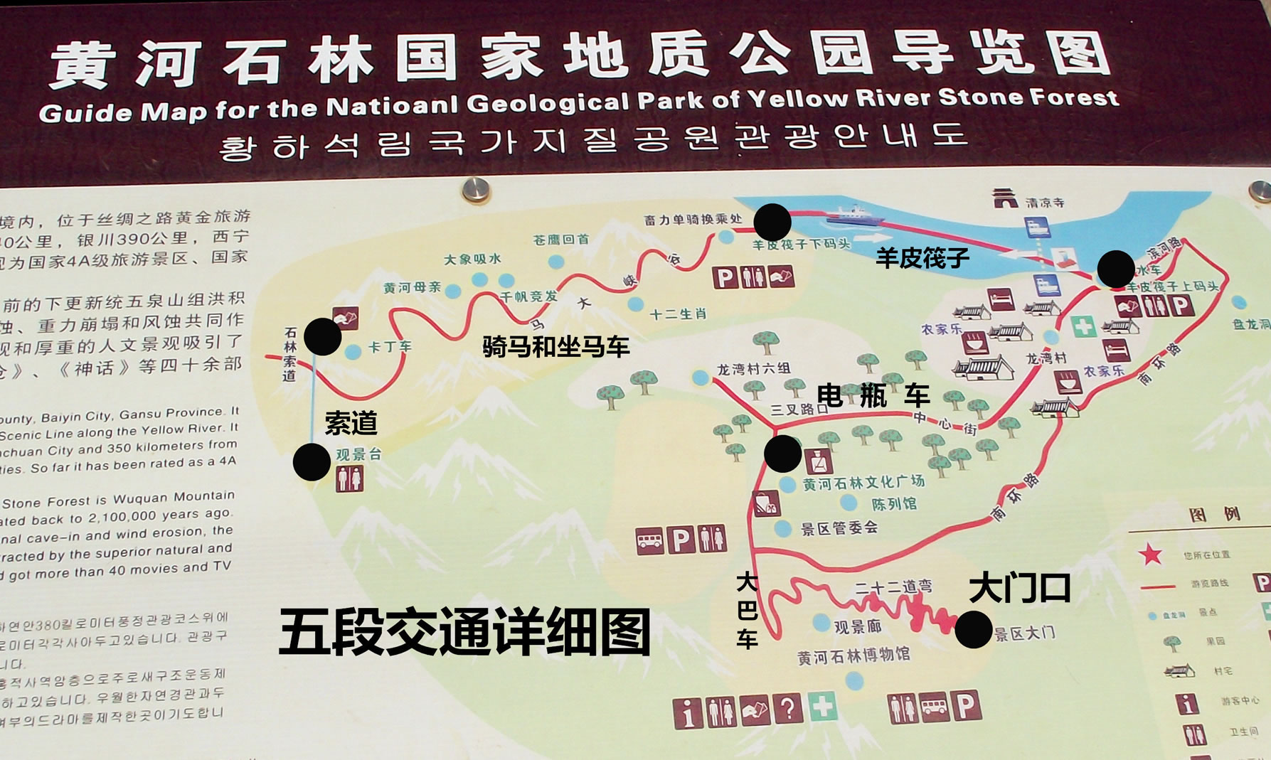 園內(nèi)包括飲馬溝(含老龍溝、豹子溝)、蟠龍洞——觀音崖、地灣三個(gè)主要景區(qū)。是一座集地貌地質(zhì)、地質(zhì)構(gòu)造、自然景觀和人文歷史于一體的綜合型地質(zhì)公園,它巧妙的將古石林群、黃河、沙漠、綠洲、戈壁、農(nóng)莊結(jié)合在一起,完美的呈現(xiàn)了一派世外桃源的景觀。景區(qū)核心景觀——古石林群形成于210萬年前的積砂礫巖層,由于新構(gòu)造運(yùn)動(dòng),雨洪侵蝕及重力崩塌,形成許多高80-200米的峭壁、巖柱組成的峰林和峰叢。十里長峽,如同畫廊。奇峰絕壁,崖壑裂隙,千姿百態(tài),神妙無窮;蛲ねび窳,婀娜秀麗;或粗獷古樸,壯觀恢宏。 景區(qū)集中展現(xiàn)了純天然、大構(gòu)造、多層次的地質(zhì)構(gòu)造,浸透著雄、奇、險(xiǎn)、古、野、幽的原始風(fēng)韻,充分體現(xiàn)了粗獷、雄渾、樸拙、厚重的西部特色,令人嘆為觀止,留連忘返。